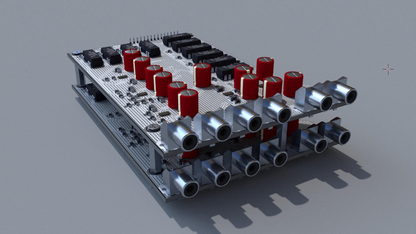 The power supply is two separate circuits; standby, logic and relay power is supplied through a single 5V supply rail, always live; in the prototype this is shown as a regular power transformer but using a switch mode would be considered. In standby mode, the microcontroller switches off all function except for an interrupt routine which detects user interaction with the control dial. Power for the audio circuitry is via a separate low noise power supply, primary switched by the standby circuitry. Power on/off mute is also handled by the microcontroller to prevent spurious pops or clicks. All microcontroller function is contained on a PCB attached to the unit's front panel with only D.C. power, relay drive and audio feedback (for the bargraph VU) shared with the separate audio assemblies. This modular approach helps ensure immunity from high frequency noise transmission from the controller's clock circuitry. Ground planes on the audio PCBs are hash poured to increase EMI immunity. Each audio circuit is supplied via a tuned RC filter to increase immunity to power supply noise.