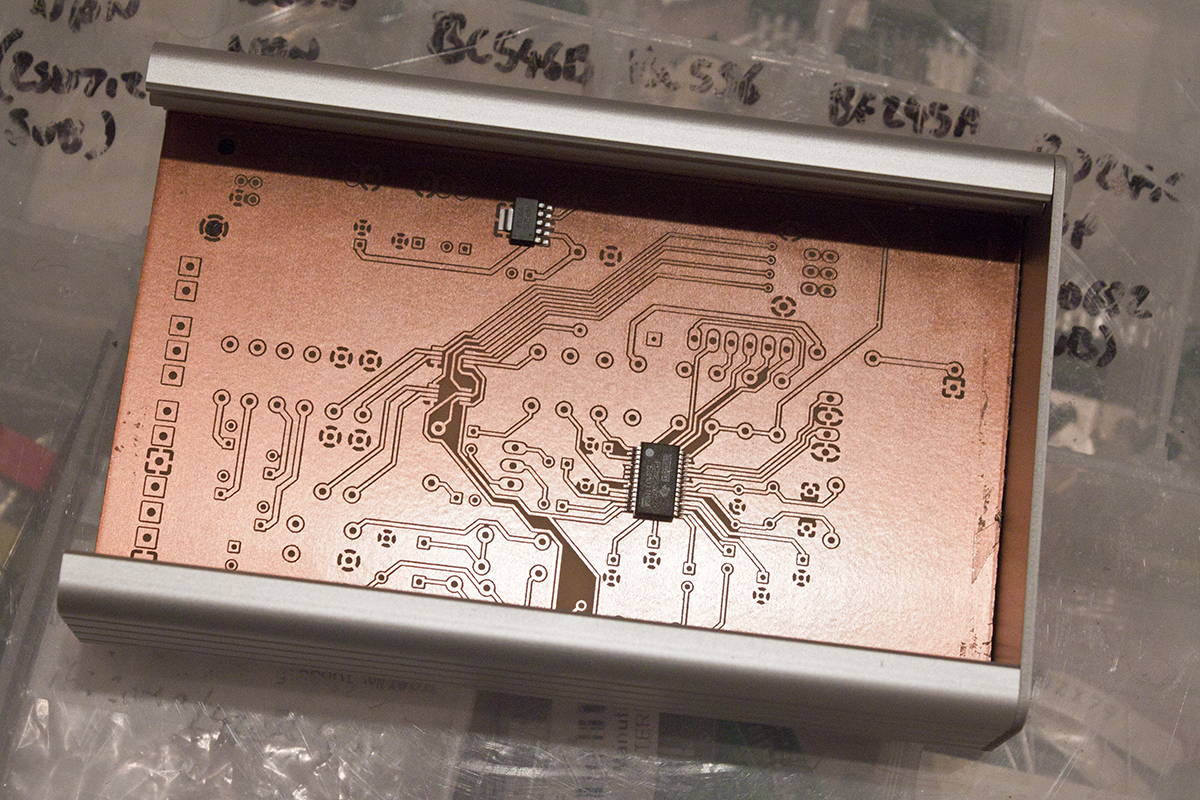 For ease of modification, the prototype device was built using through hole components where possible, with the intention to move toward surface mount for production. I developed the prototype PCB at home and milled the enclosure and engraved the graphics using my miniature CNC machine; I trialed engraving as a proof of concept, the result is good but a slow process and therefore unsuitable for production use. My intention for production would be to have the enclosures machined and silk screened by the manufacturer. I made some tweaks to the PCB during development and the resulting performance was good with a broadly flat frequency response, good noise floor and when compared side-by-side with our existing system, equal or better subjective audio quality.