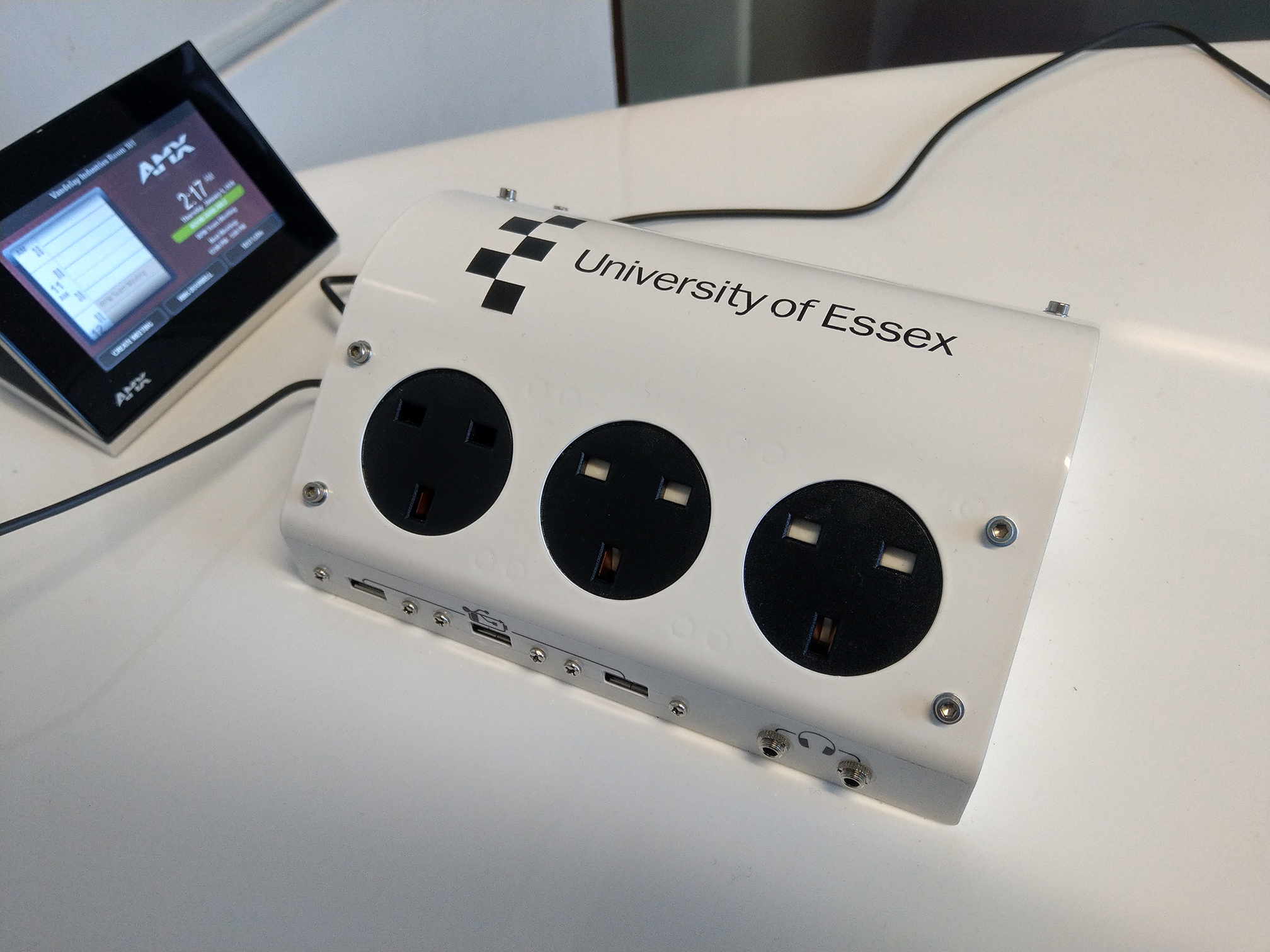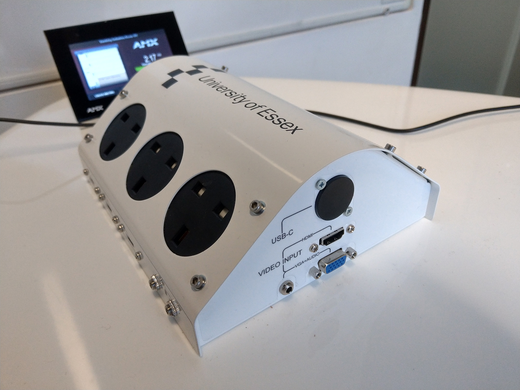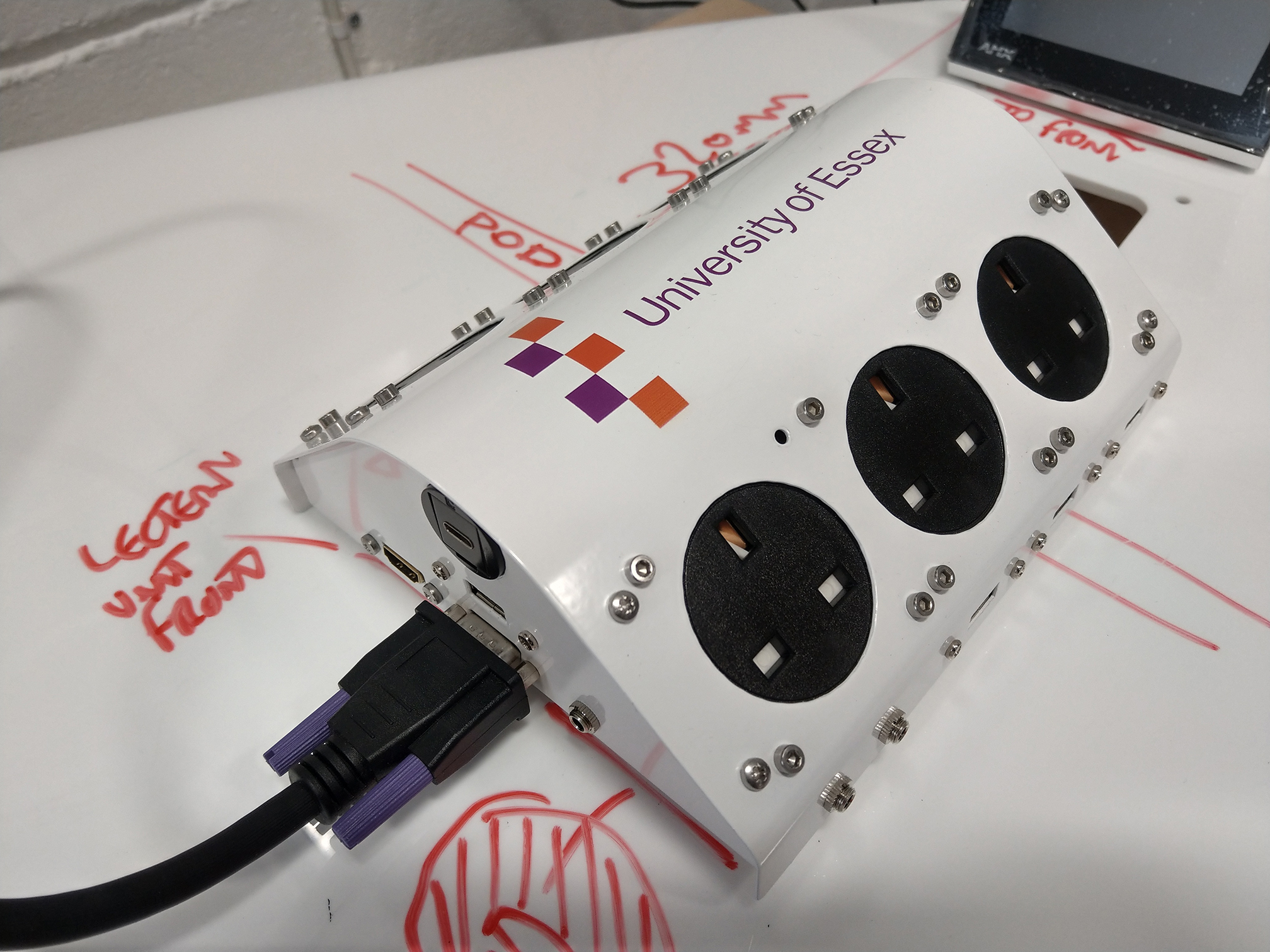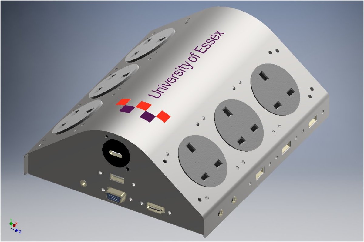 After submitting both proposals to the manufacturer for costing and some discussion based around the cosmetics and features of each design, one was chosen based on overall cost and footprint on the desk surface and a prototype unit was manufactured. After some minor alterations to the design and some positive user feedback - at the time of writing, these have been installed for over a year without fault and the university now wants to install them in other areas - a batch order was submitted with the production units delivered as an empty shell and populated in house. For a finishing touch, I added university branding and some labels, sending these to the manufacturer in the form of vector images for silk screening.